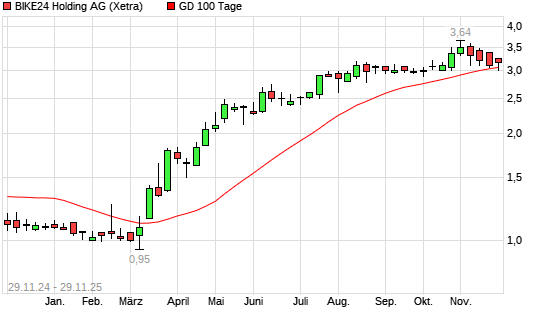 Mit dem Anstieg auf 3,12 EUR hat die BIKE24 Holding AG-Aktie am 28.11.2025 die 100-Tage-Linie nach oben gekreuzt.