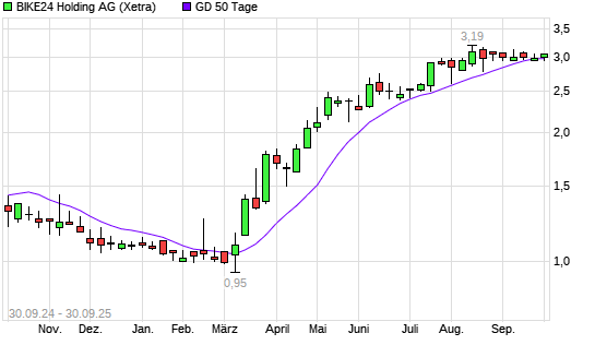 Mit dem Rücksetzer auf 2,96 EUR hat die BIKE24 Holding AG-Aktie am 29.09.2025 die 50-Tage-Linie nach unten gekreuzt.