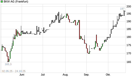 Mit dem Anstieg auf 196,70 EUR hat die BKW AG Namenaktie-Aktie (ISIN CH0130293662) am 23.10.2025 ein neues All-Time-High erreicht und damit den Kurs vom 22.07.2025 eingestellt.