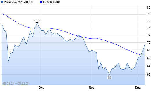 Mit dem Anstieg auf 67,55 EUR hat die BMW Vz-Aktie am 04.12.2024 die 38-Tage-Linie nach oben gekreuzt.
