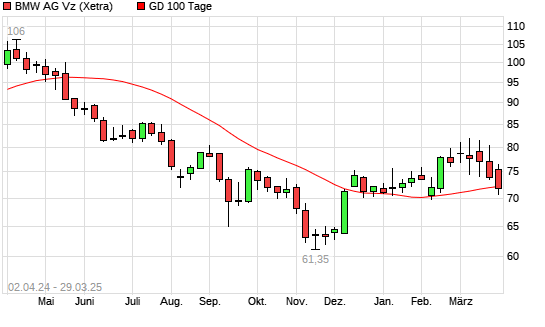 Mit dem Rücksetzer auf 72,35 EUR hat die BMW Vz-Aktie am 28.03.2025 die 100-Tage-Linie nach unten gekreuzt.