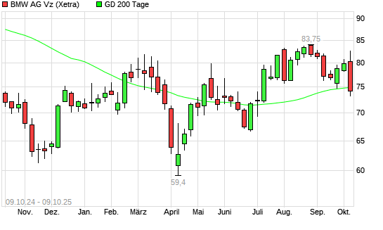 Mit dem Rücksetzer auf 73,85 EUR hat die BMW Vz-Aktie am 08.10.2025 die 200-Tage-Linie nach unten gekreuzt.Die BMW Vz-Aktie befand sich seit dem 02.07.2025 im langfristigen Abwärtstrend ...weiterlesen