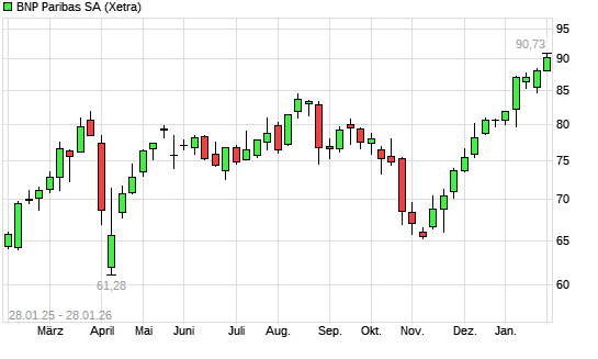 Mit dem Anstieg auf 90,49 EUR hat die BNP Paribas-Aktie (ISIN FR0000131104) am 27.01.2026 ein neues 10-Jahres-Hoch erreicht und damit den Kurs vom 26.01.2026 eingestellt.