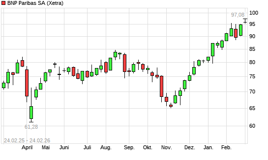 Mit dem Anstieg auf 95,76 EUR hat die BNP Paribas-Aktie (ISIN FR0000131104) am 23.02.2026 ein neues All-Time-High erreicht und damit den Kurs vom 20.02.2026 eingestellt.