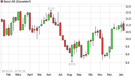 Mit dem Anstieg auf 11,39 EUR hat die BOOZT AB-Aktie (ISIN SE0009888738) am 06.01.2025 ein neues 6-Monats-Hoch erreicht und damit den Kurs vom 12.12.2024 eingestellt.