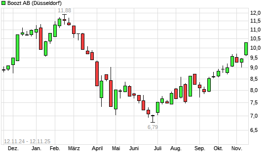Mit dem Anstieg auf 9,93 EUR hat die BOOZT AB-Aktie (ISIN SE0009888738) am 11.11.2025 ein neues 6-Monats-Hoch erreicht und damit den Kurs vom 24.10.2025 eingestellt.