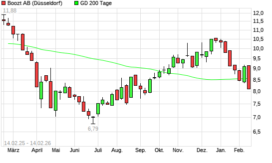 Mit dem Rücksetzer auf 8,36 EUR hat die BOOZT AB-Aktie am 13.02.2026 die 200-Tage-Linie nach unten gekreuzt.Die BOOZT AB-Aktie befand sich seit dem 06.02.2026 im langfristigen Aufwärtstrend ...weiterlesen