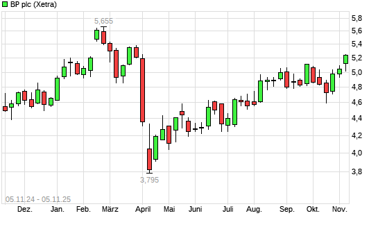 Mit dem Anstieg auf 5,12 EUR hat die BP-Aktie (ISIN GB0007980591) am 04.11.2025 ein neues 6-Monats-Hoch erreicht und damit den Kurs vom 26.09.2025 eingestellt.