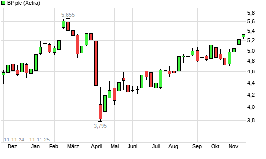 Mit dem Anstieg auf 5,32 EUR hat die BP-Aktie (ISIN GB0007980591) am 10.11.2025 ein neues 6-Monats-Hoch erreicht und damit den Kurs vom 07.11.2025 eingestellt.