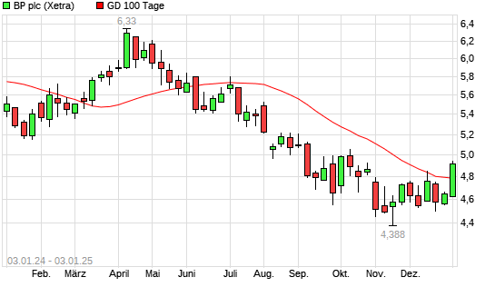 Mit dem Anstieg auf 4,87 EUR hat die BP-Aktie am 02.01.2025 die 100-Tage-Linie nach oben gekreuzt.