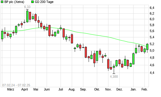 Mit dem Anstieg auf 5,13 EUR hat die BP-Aktie am 06.02.2025 die 200-Tage-Linie nach oben gekreuzt.