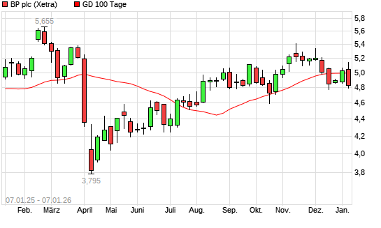 Mit dem Rücksetzer auf 4,96 EUR hat die BP-Aktie am 06.01.2026 die 100-Tage-Linie nach unten gekreuzt.