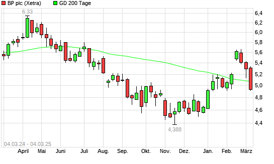 Mit dem Rücksetzer auf 5,05 EUR hat die BP-Aktie am 03.03.2025 die 200-Tage-Linie nach unten gekreuzt.