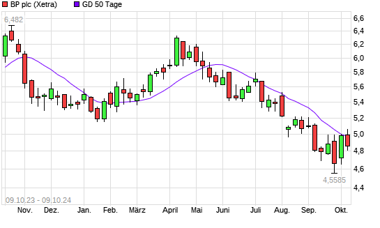 Mit dem Rücksetzer auf 4,86 EUR hat die BP-Aktie am 08.10.2024 die 50-Tage-Linie nach unten gekreuzt.
