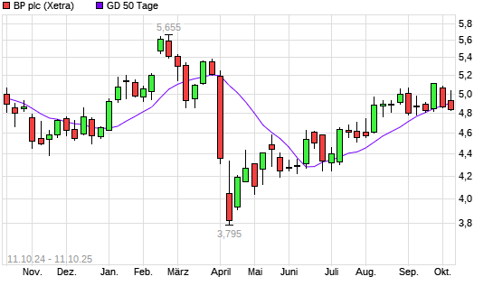 Mit dem Rücksetzer auf 4,81 EUR hat die BP-Aktie am 10.10.2025 die 50-Tage-Linie nach unten gekreuzt.
