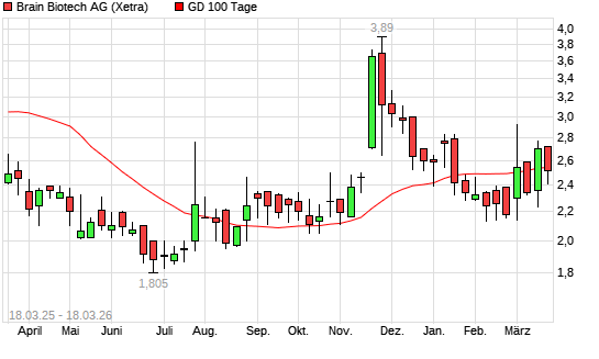 Mit dem Anstieg auf 2,58 EUR hat die BRAIN Biotech AG-Aktie am 17.03.2026 die 100-Tage-Linie nach oben gekreuzt.