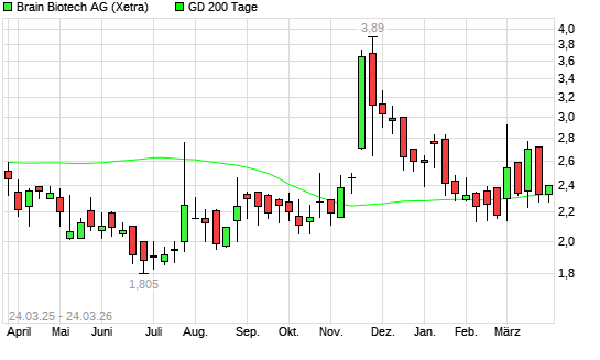 Mit dem Rücksetzer auf 2,26 EUR hat die BRAIN Biotech AG-Aktie am 23.03.2026 die 200-Tage-Linie nach unten gekreuzt.