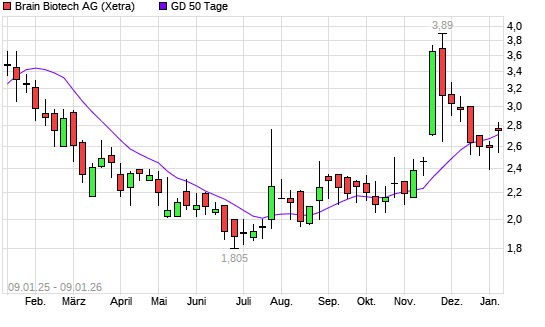 Mit dem Rücksetzer auf 2,70 EUR hat die BRAIN Biotech AG-Aktie am 08.01.2026 die 50-Tage-Linie nach unten gekreuzt.