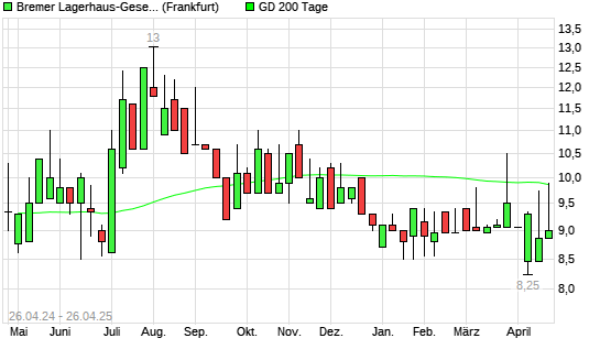 Mit dem Rücksetzer auf 9,00 EUR hat die BREMER LAGERH.N.AKT.O.N.-Aktie am 25.04.2025 die 200-Tage-Linie nach unten gekreuzt.