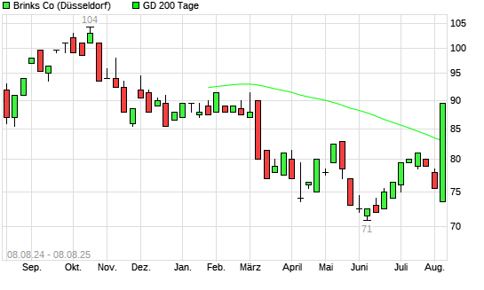 Mit dem Anstieg auf 84,50 EUR hat die BRINKS CO-Aktie am 07.08.2025 die 200-Tage-Linie nach oben gekreuzt.