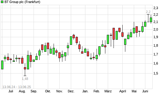 Mit dem Anstieg auf 2,18 EUR hat die BT Group-Aktie (ISIN GB0030913577) am 12.06.2025 ein neues 12-Monats-Hoch erreicht und damit den Kurs vom 11.06.2025 eingestellt.
