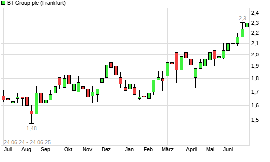 Mit dem Anstieg auf 2,28 EUR hat die BT Group-Aktie (ISIN GB0030913577) am 23.06.2025 ein neues 12-Monats-Hoch erreicht und damit den Kurs vom 19.06.2025 eingestellt.