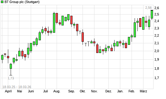 Mit dem Anstieg auf 2,52 EUR hat die BT Group-Aktie (ISIN GB0030913577) am 17.03.2026 ein neues 6-Monats-Hoch erreicht und damit den Kurs vom 16.03.2026 eingestellt.