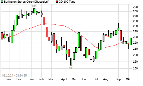 Mit dem Anstieg auf 222,00 EUR hat die BURLINGTON STORES-Aktie am 07.10.2025 die 100-Tage-Linie nach oben gekreuzt.