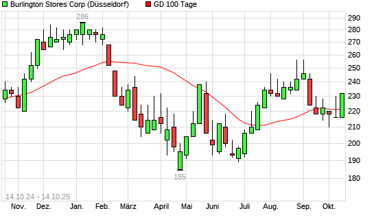 Mit dem Rücksetzer auf 220,00 EUR hat die BURLINGTON STORES-Aktie am 13.10.2025 die 100-Tage-Linie nach unten gekreuzt.