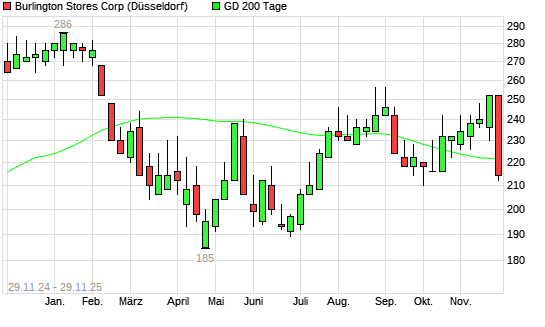 Mit dem Rücksetzer auf 220,00 EUR hat die BURLINGTON STORES-Aktie am 28.11.2025 die 200-Tage-Linie nach unten gekreuzt.