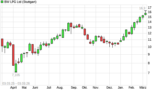 Mit dem Anstieg auf 16,10 EUR hat die BW LPG-Aktie (ISIN SGXZ69436764) am 02.03.2026 ein neues 12-Monats-Hoch erreicht und damit den Kurs vom 27.02.2026 eingestellt.