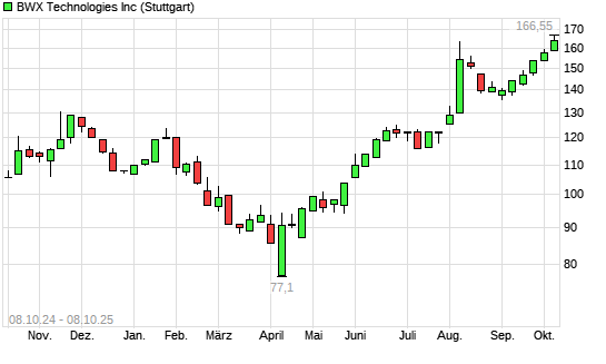 Mit dem Anstieg auf 166,20 EUR hat die BWX Technologies-Aktie (ISIN US05605H1005) am 07.10.2025 ein neues All-Time-High erreicht und damit den Kurs vom 03.10.2025 eingestellt.