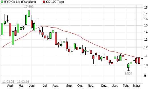 Mit dem Rücksetzer auf 10,63 EUR hat die BYD-Aktie am 10.03.2026 die 100-Tage-Linie nach unten gekreuzt.