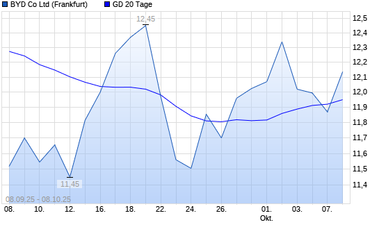 Mit dem Rücksetzer auf 11,87 EUR hat die BYD-Aktie am 07.10.2025 die 20-Tage-Linie nach unten gekreuzt.