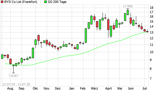Mit dem Rücksetzer auf 13,08 EUR hat die BYD-Aktie am 10.07.2025 die 200-Tage-Linie nach unten gekreuzt.