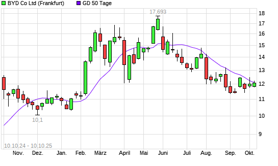 Mit dem Rücksetzer auf 12,01 EUR hat die BYD-Aktie am 09.10.2025 die 50-Tage-Linie nach unten gekreuzt.