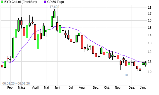 Mit dem Rücksetzer auf 10,71 EUR hat die BYD-Aktie am 05.01.2026 die 50-Tage-Linie nach unten gekreuzt.