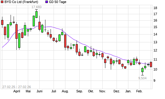 Mit dem Rücksetzer auf 10,25 EUR hat die BYD-Aktie am 26.02.2026 die 50-Tage-Linie nach unten gekreuzt.