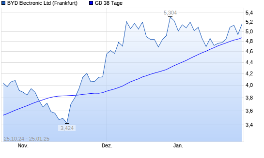 Mit dem Anstieg auf 5,15 EUR hat die BYD Electronic-Aktie am 24.01.2025 die 38-Tage-Linie nach oben gekreuzt.