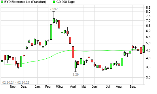 Mit dem Rücksetzer auf 4,54 EUR hat die BYD Electronic-Aktie am 01.10.2025 die 200-Tage-Linie nach unten gekreuzt.