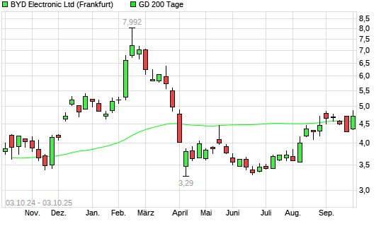 Mit dem Anstieg auf 4,74 EUR hat die BYD Electronic-Aktie am 02.10.2025 die 200-Tage-Linie nach oben gekreuzt.Die BYD Electronic-Aktie befand sich seit dem 01.10.2025 im langfristigen Abwärtstrend ...weiterlesen