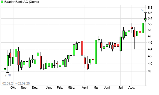 Mit dem Anstieg auf 5,40 EUR hat die Baader Bank-Aktie (ISIN DE0005088108) am 01.09.2025 ein neues 3-Jahres-Hoch erreicht und damit den Kurs vom 08.07.2025 eingestellt.