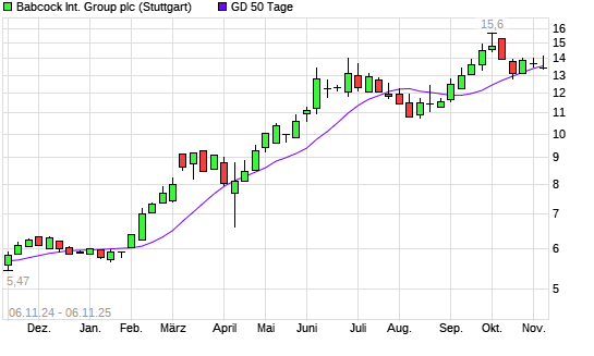 Mit dem Rücksetzer auf 13,68 EUR hat die Babcock International Group-Aktie am 05.11.2025 die 50-Tage-Linie nach unten gekreuzt.