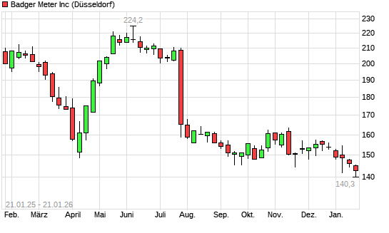Mit dem Rücksetzer auf 140,60 EUR hat die Badger Meter-Aktie (ISIN US0565251081) am 20.01.2026 ein neues 12-Monats-Tief erreicht und damit den Kurs vom 07.01.2026 eingestellt.
