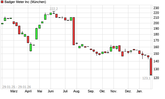 Mit dem Rücksetzer auf 135,10 EUR hat die Badger Meter-Aktie (ISIN US0565251081) am 28.01.2026 ein neues 12-Monats-Tief erreicht und damit den Kurs vom 27.01.2026 eingestellt.