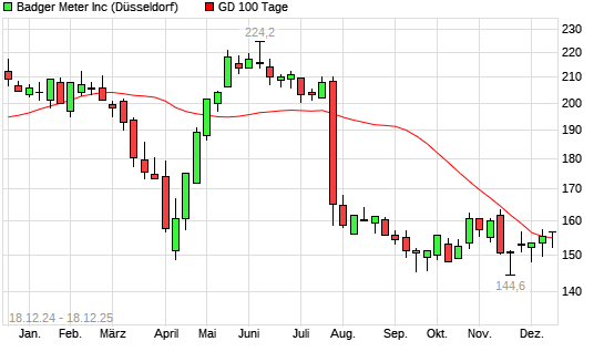 Mit dem Rücksetzer auf 152,40 EUR hat die Badger Meter-Aktie am 17.12.2025 die 100-Tage-Linie nach unten gekreuzt.