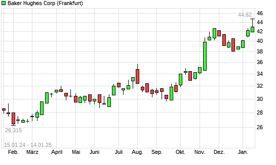 Mit dem Anstieg auf 44,27 EUR hat die Baker Hughes-Aktie (ISIN US05722G1004) am 13.01.2025 ein neues 5-Jahres-Hoch erreicht und damit den Kurs vom 22.11.2024 eingestellt.