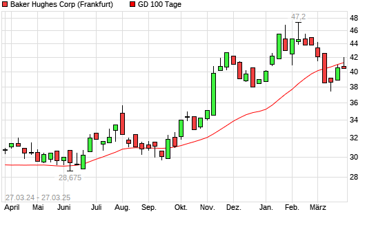 Mit dem Rücksetzer auf 41,24 EUR hat die Baker Hughes-Aktie am 26.03.2025 die 100-Tage-Linie nach unten gekreuzt.