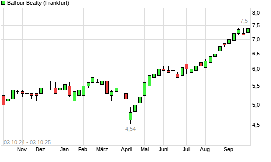 Mit dem Anstieg auf 7,50 EUR hat die Balfour Beatty-Aktie (ISIN GB0000961622) am 02.10.2025 ein neues All-Time-High erreicht und damit den Kurs vom 01.10.2025 eingestellt.