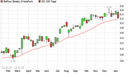 Mit dem Rücksetzer auf 5,20 EUR hat die Balfour Beatty-Aktie am 09.01.2025 die 100-Tage-Linie nach unten gekreuzt.
